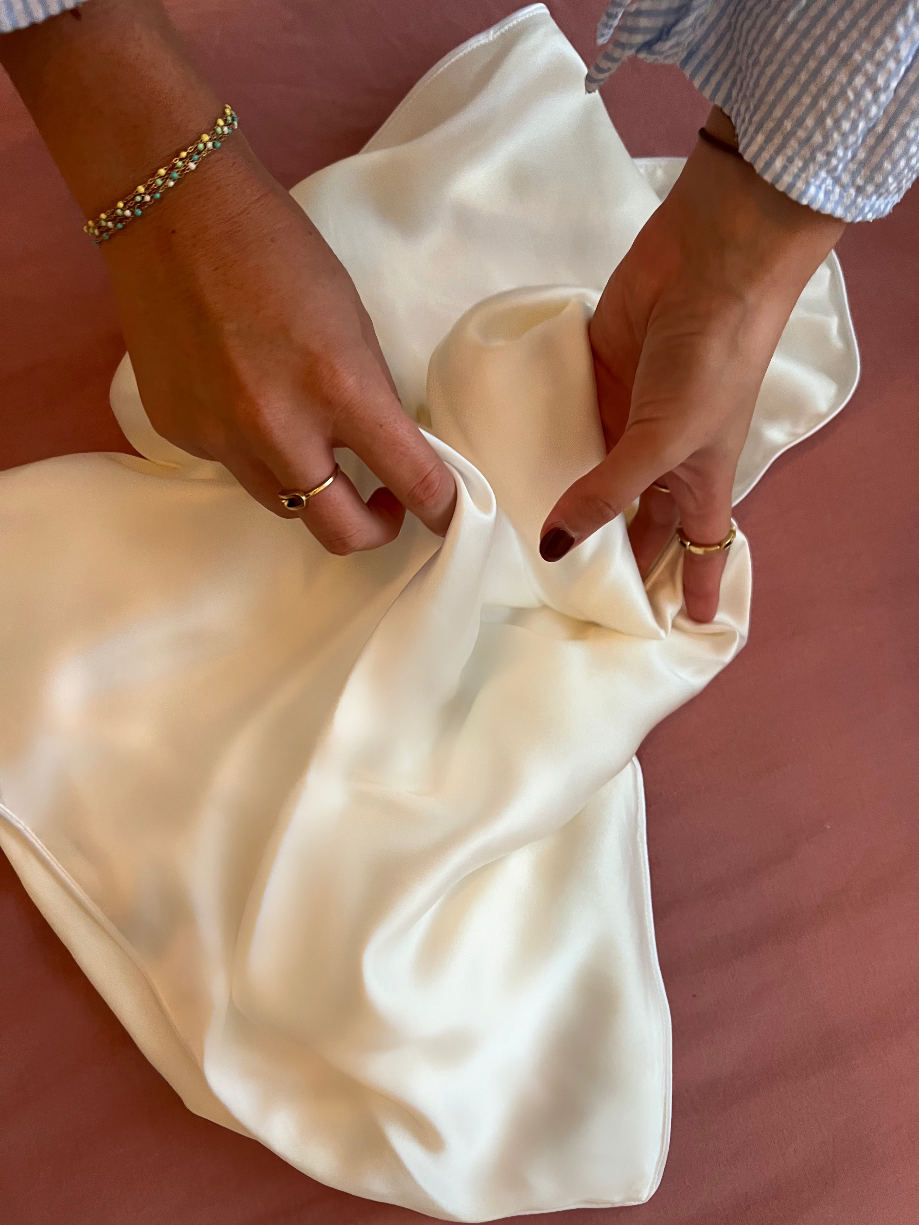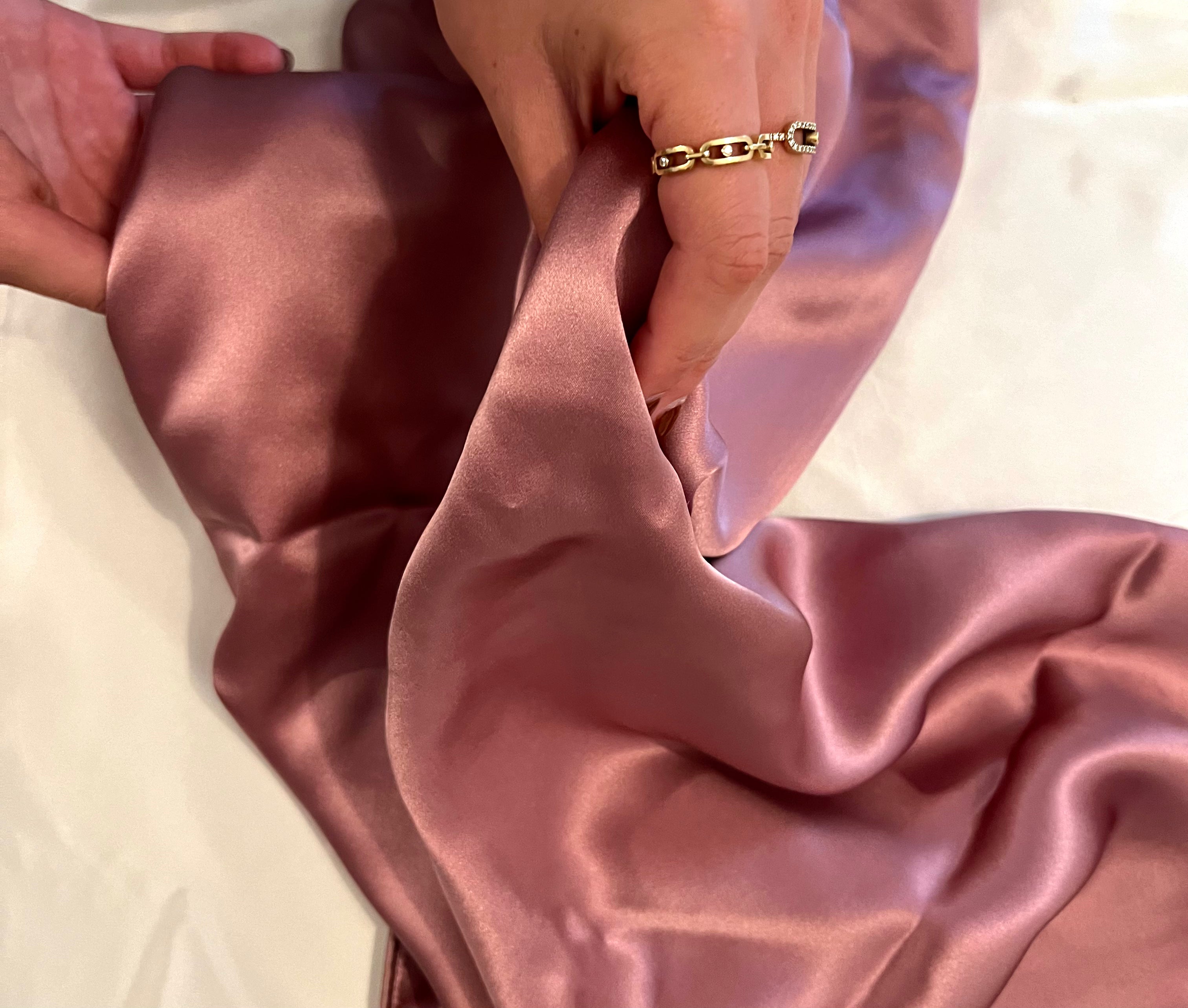 Quant au satin, (qui est une technique de tissage et non une matière), bien qu'également doux, ne vous apportera pas les bienfaits de la soie pour votre peau et vos cheveux, ne s'agissant pas d'une matière naturelle.