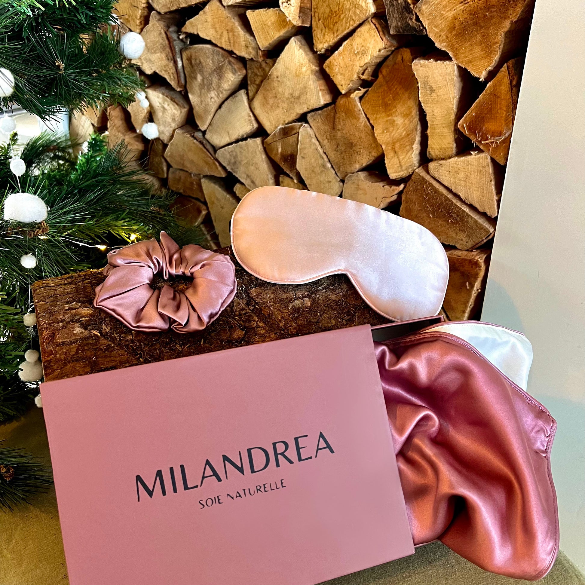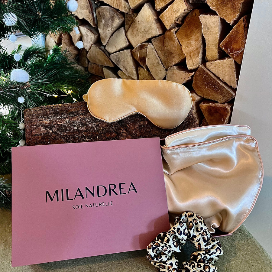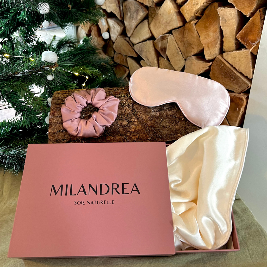 Le coffret sommeil Milandrea comprend une taie d'oreiller en soie de mûrier, un masque de nuit en soie et un chouchou assorti. Ces trois produits sont conçus pour améliorer votre confort nocturne et prendre soin de votre peau et de vos cheveux pendant votre sommeil.