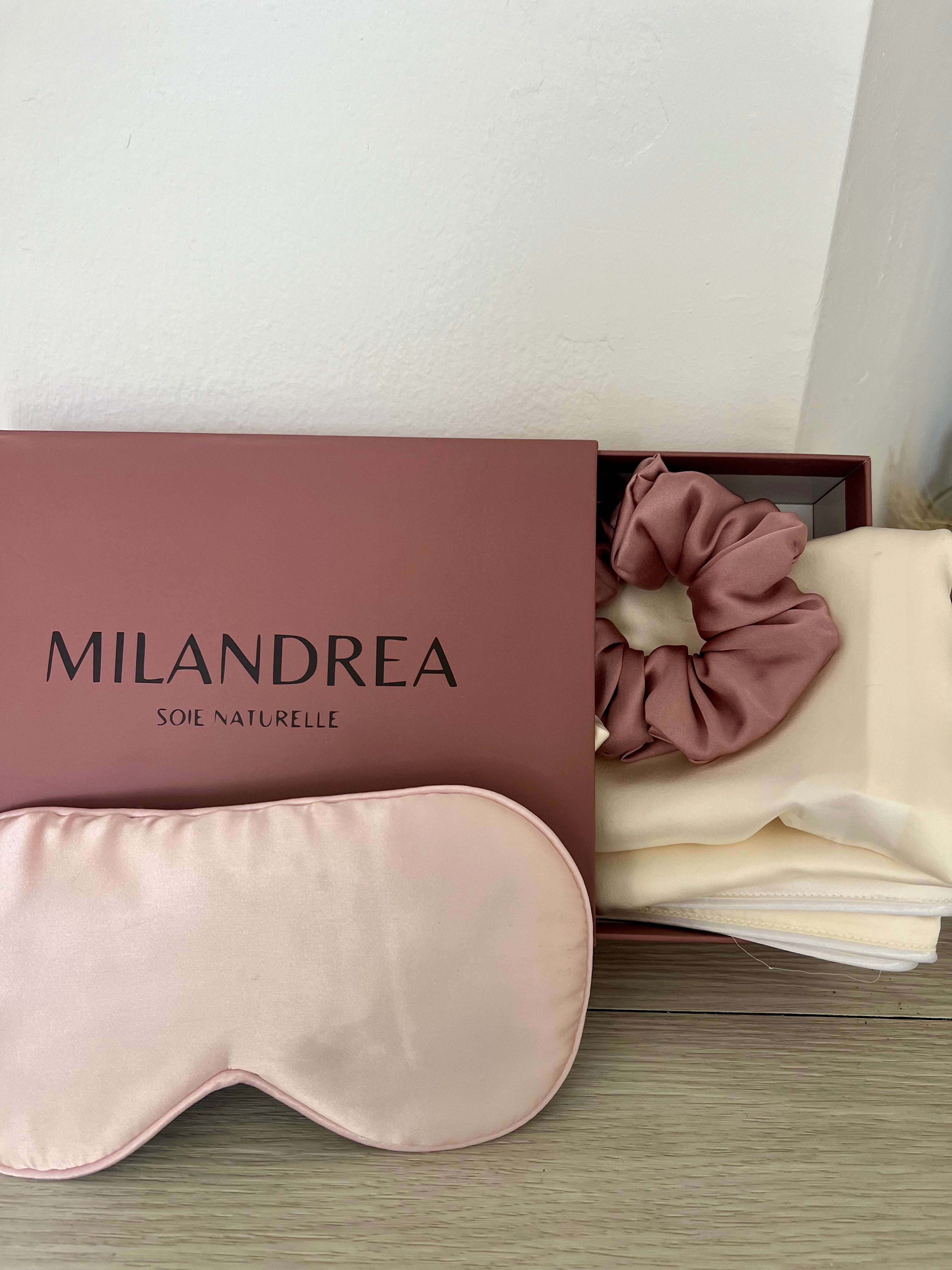 Le coffret sommeil Milandrea comprend une taie d'oreiller en soie de mûrier, un masque de nuit en soie et un chouchou assorti. Ces trois produits sont conçus pour améliorer votre confort nocturne et prendre soin de votre peau et de vos cheveux pendant votre sommeil.