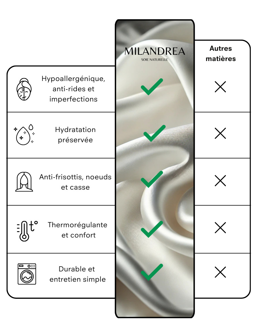 Fini les frisottis, les fourches, la casse et les cheveux secs ! La soie, avec sa texture exceptionnellement lisse, réduit les frictions et protège vos cheveux des dommages. Vos cheveux retrouvent leur éclat naturel, sont plus soyeux, brillants et sans noeuds dès le réveil, pour des matins plus faciles et des cheveux plus sains jour après jour.